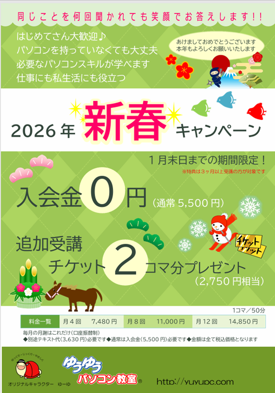 ゆうゆうパソコン教室では、ご利用後のパソコ ンや机の消毒を徹底、換気にも注意し営業しております。みなさまにおかれましては、受講前後の手指消毒を引き続きお願いします。また、発熱等体調が悪い場合には受講をお控え下さいませ。